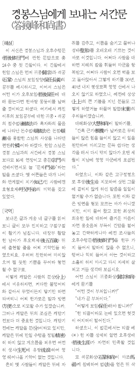 한암일발록중에서_경봉스님에게 보내는 서간문1