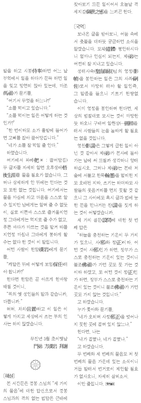 한암일발록중에서_경봉스님에게 보내는 서간문2