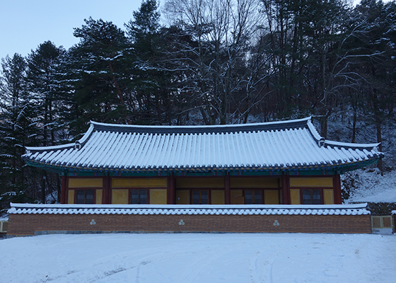 이 불전은 공포 내 외부의 장식적인 조각솜씨 및 구조수법등으로 보아 1900년대 초에 건립 된 것으로 추정되며 1976년 보수 단청하였다. 대웅전 앞 좌우에는 90여평의 심검당(尋劍堂), 설선당(說禪堂)의 승사(事)가 있고, 심검당 뒤에 서상원(瑞像院)과 설선당 뒤에 요사가 있다. 정면에는 보광루가 있는데, 내부 바닥에는 짚으로 만든 우리 고유의 멍석을 깔았다.