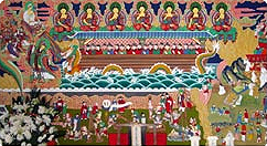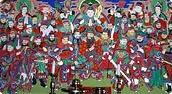 대웅전 신중탱화불법(佛法)을 수호하는 여러 선신(善神)을 도상화한 그림을 신중탱화라고 합니다. 많은 신들을 배치하여 그리므로 다양하고 복잡한 구도를 보이는 신중탱화는 일반적으로 제석(帝釋)과 하늘의 군사인 천룡(天龍)을 중심으로 주위에는 무장을 한 신중들을 배치합니다. 그리고 이 신중탱화의 역할은 그 범위를 넓혀 참배자의 심성에 내재한 온갖 잡신을 음으로써 인간심성에 청정함을 갖게하여 이것이 곧 또다른 호법과 호신의 길임을 깨닫게 합니다.