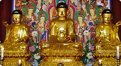 대웅전 불단삼세불(三世佛)을 모시고 있는 불단으로 중심에는 현재불을 상징하는 석가불좌상, 오른쪽에는 미래불인 아미타불좌상, 왼쪽에는 과거불을 상징하는 약사불좌상입니다. 주존으로 모신 석가불은 연화좌에 결가부좌하여 항촉지인을 결하고 있습니다. 사각형의 얼굴에 눈은 반개하고 둥근 육계에는 계주가 박혀 있습니다. 양쪽에서 협사를 이루는 불좌상은 손가짐만 반대 방향으로 같은 형식으로 조성되어 있습니다.